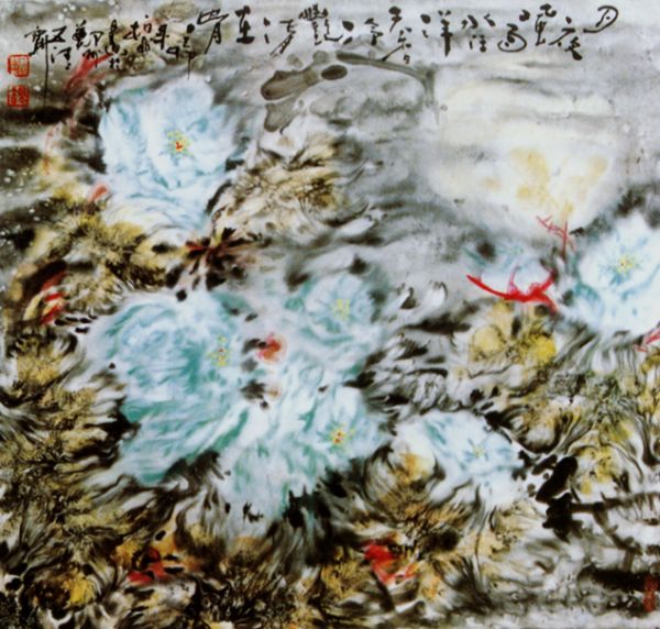 我用特殊表现手段去表现各种特殊气候,气节、各种特殊环境下牡丹的各种特殊姿态和特殊变化并有不少技法突破,通过中西技法实验性笔墨表现风、晴、雨、露、雪、霜、水、夕阳、月下、逆光、柔光、烛光、夜光、灯光、倒影、光影、幻影、云雾、沼泽、野生、山水配景,人物配景,动物配景等,开了不少先河,并有学术论文发表。这段时期我的牡丹梅花禅拳人物等作品很多作为国礼,赠送许多的国家元首,国外访华代表团出访代表团深受国际友人外宾的青睐。